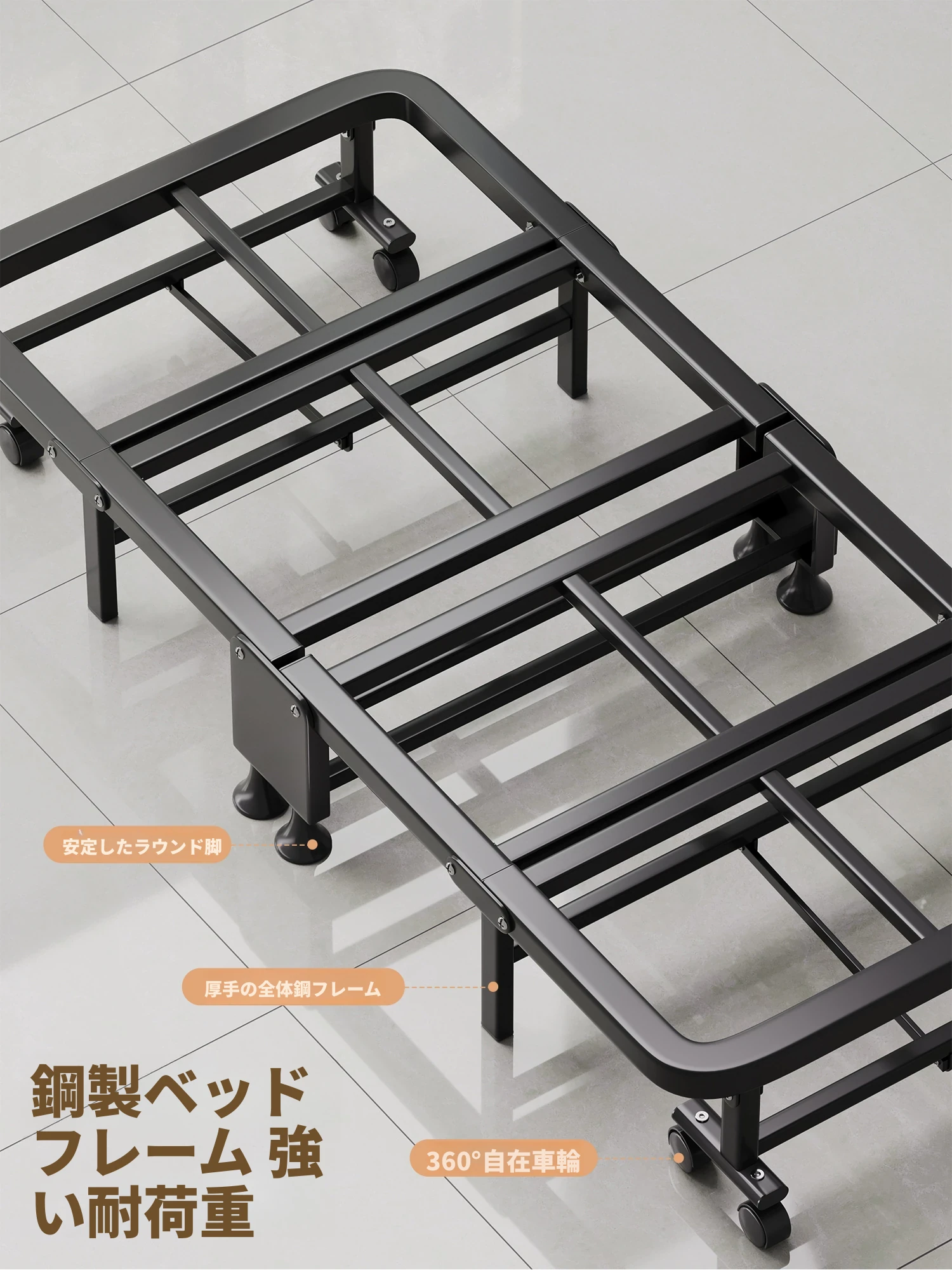 【6段調節♥防汚テクノロジー布】豪華四折ベッド-太くてスチールフレーム190*80-カーボンブラックフレーム