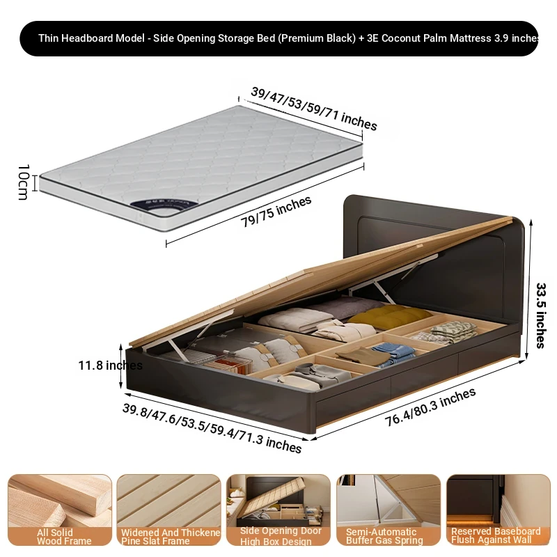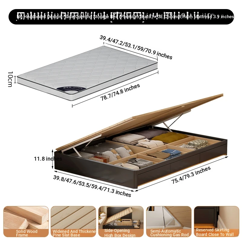【高級ブラック】ヘッドボードなし-圧力式側開き収納ベッド+3Eココナッツファイバー10cmマットレス