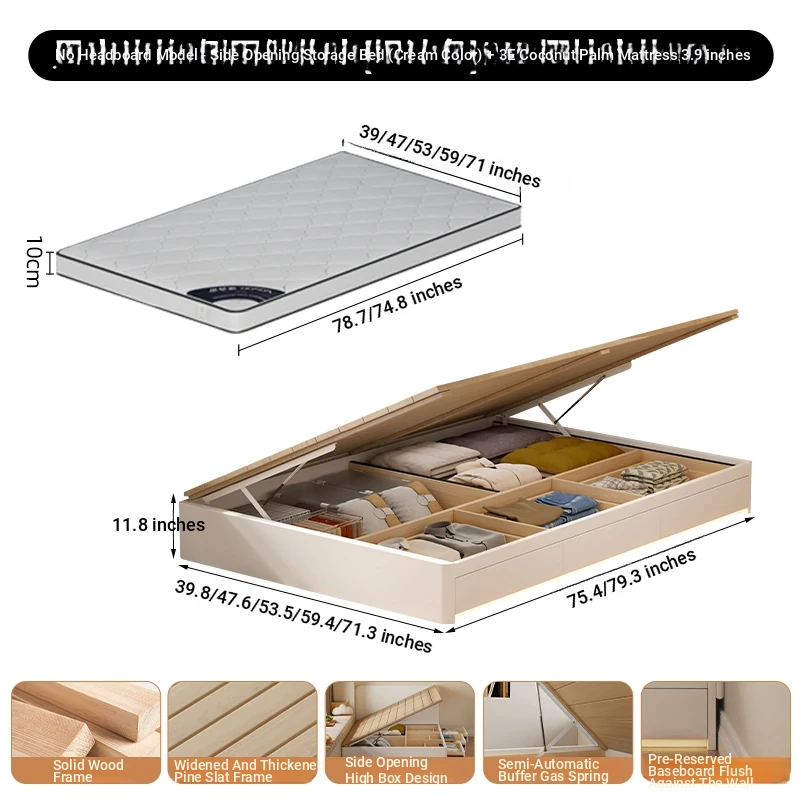 【クリーム色】ヘッドボードなし-圧力式側開き収納ベッド+3Eココナッツファイバー10cmマットレス