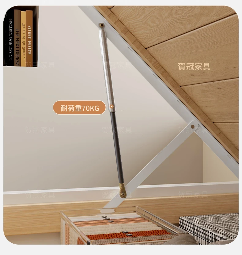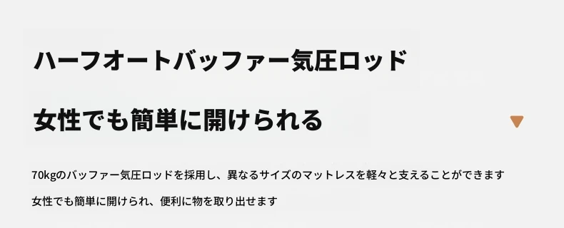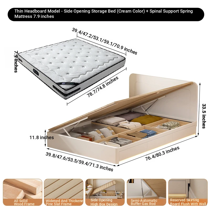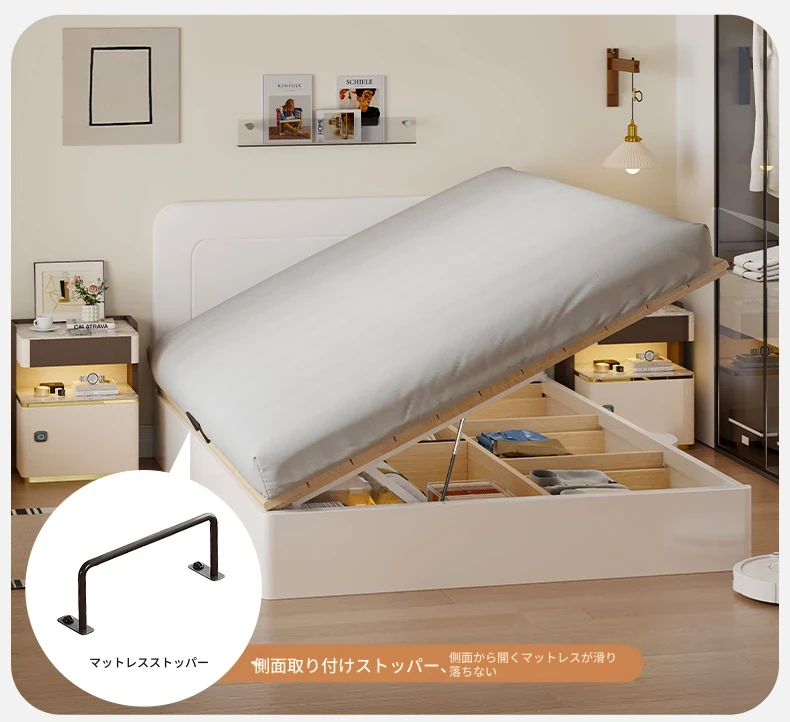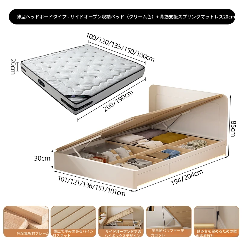 【クリーム色】薄型ヘッドボード付き-圧力式側開き収納ベッド+背中を守るスプリングマットレス20cm