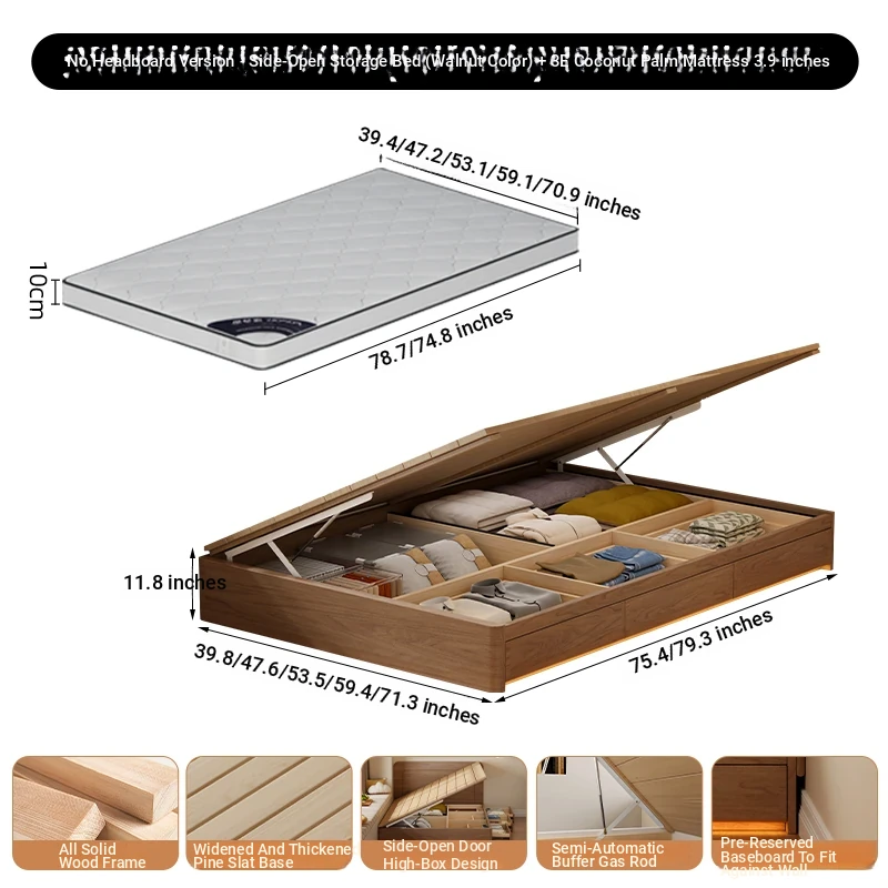【ウォルナット色】ヘッドボードなし-圧力式側開き収納ベッド+3Eココナッツファイバー10cmマットレス