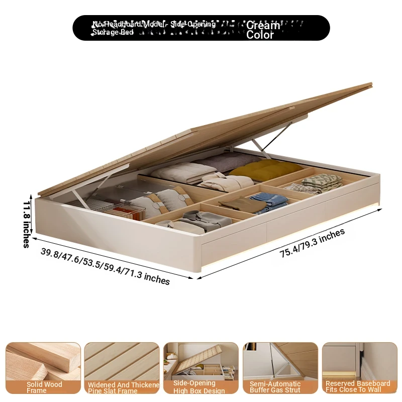 【クリーム色】ヘッドボードなし-圧力式側開き収納ベッド