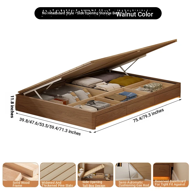 【ウォルナット色】ヘッドボードなし-圧力式側開き収納ベッド