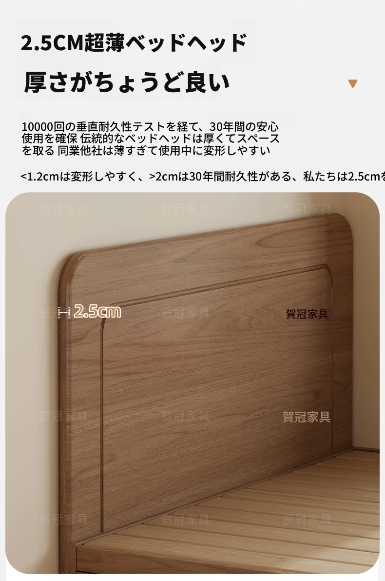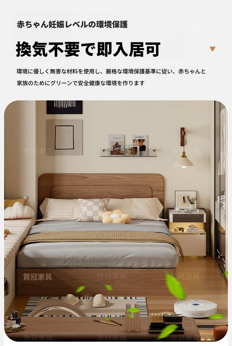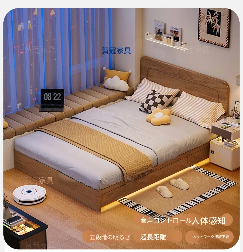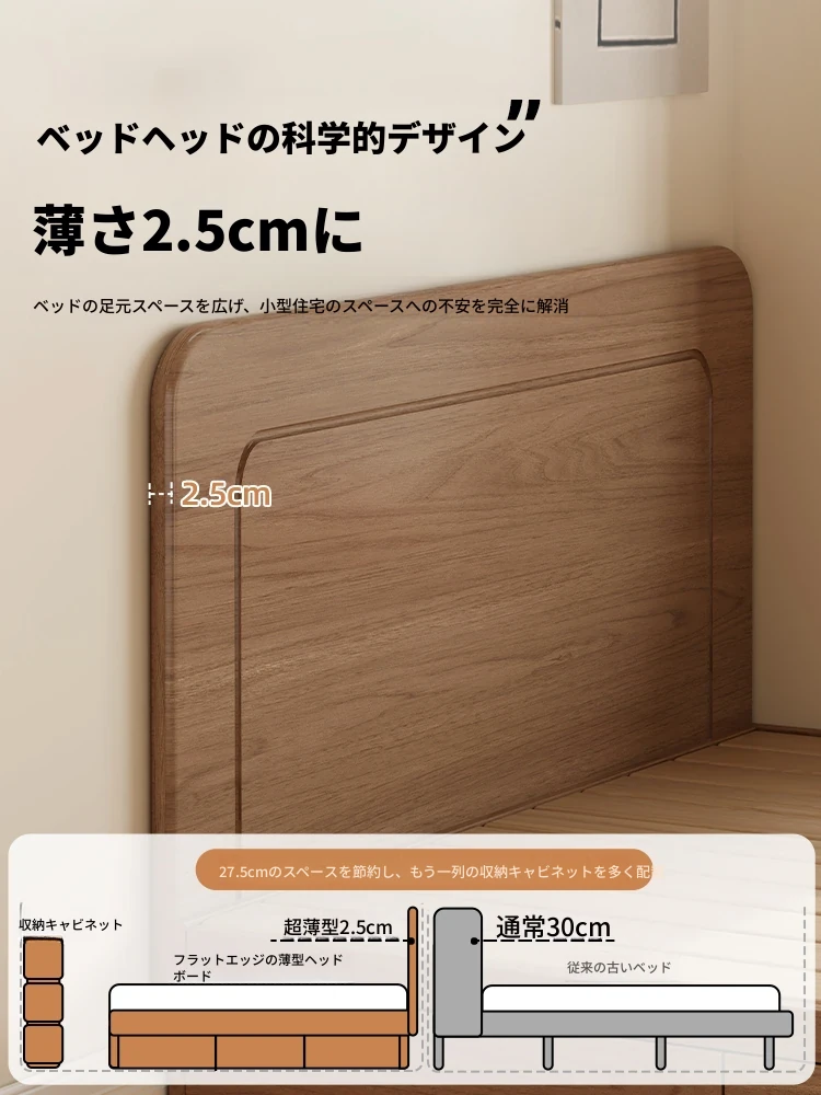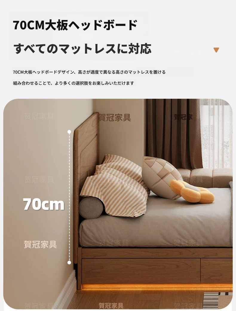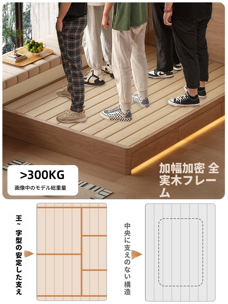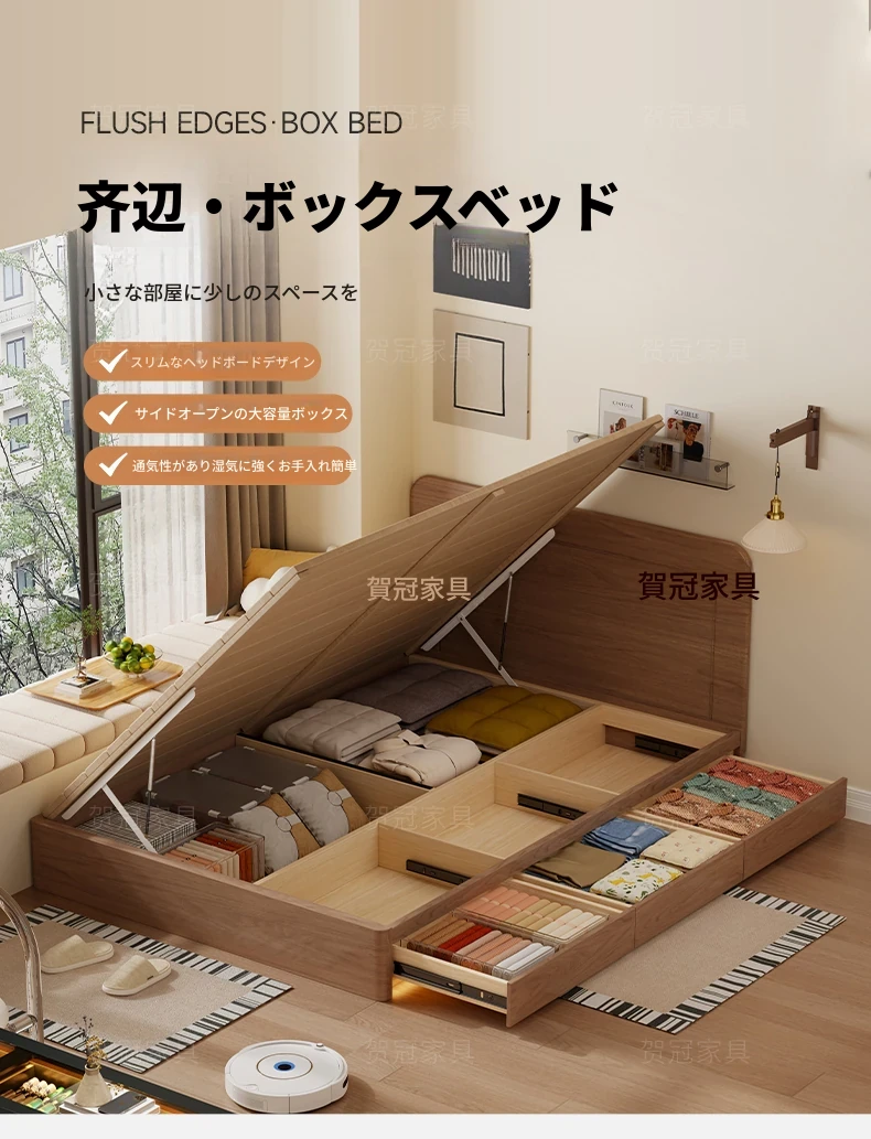 和風侘び寂びスタイルの無垢材ベッド|150cm防湿スラット&引き出し付きハイ収納ベッド|主寝室にぴったり!古き良きデザインでおしゃれ空間を演出!