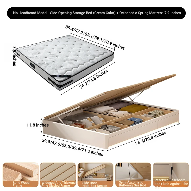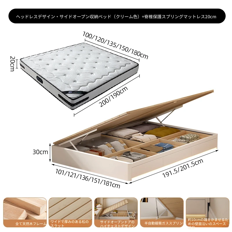 【クリーム色】ヘッドボードなし-圧力式側開き収納ベッド+背中を守るスプリングマットレス20cm