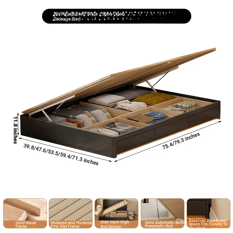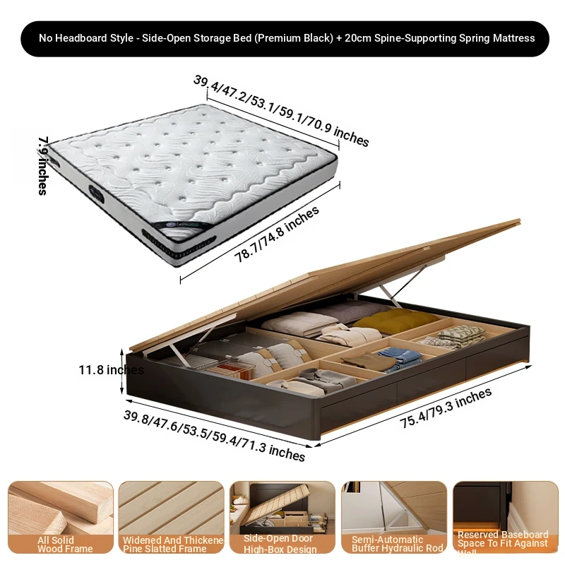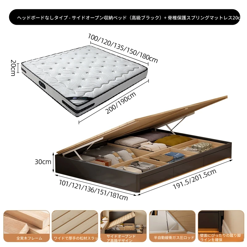 【高級ブラック】ヘッドボードなし-圧力式側開き収納ベッド+背中を守るスプリングマットレス20cm
