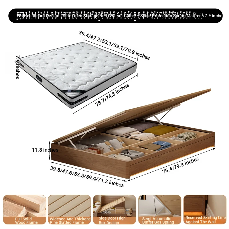 【ウォルナット色】ヘッドボードなし-圧力式側開き収納ベッド+背中を守るスプリングマットレス20cm