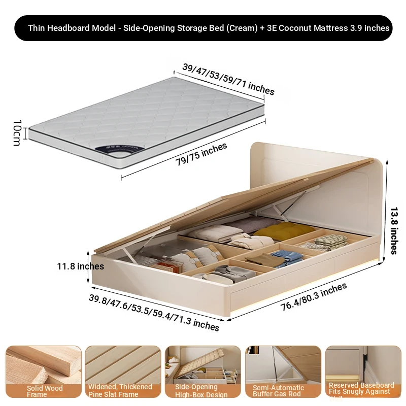 【クリーム色】薄型ヘッドボード付き-圧力式側開き収納ベッド+3Eココナッツファイバー10cmマットレス