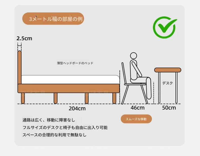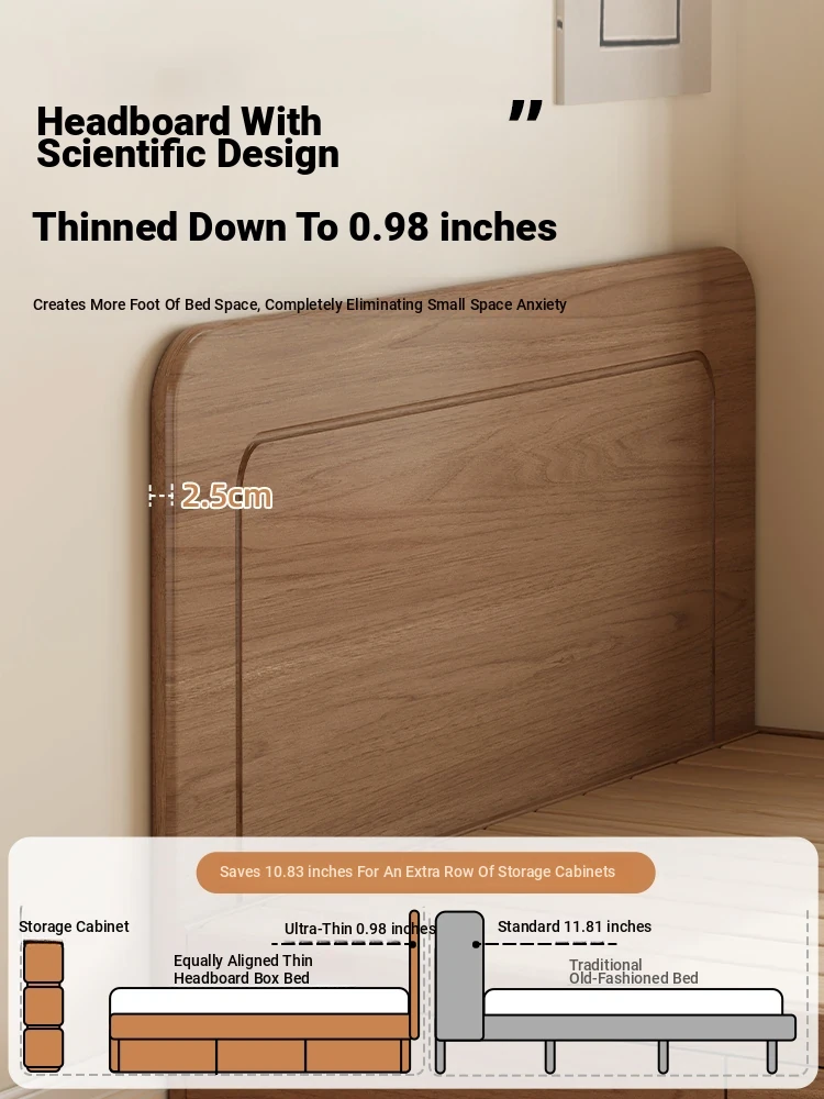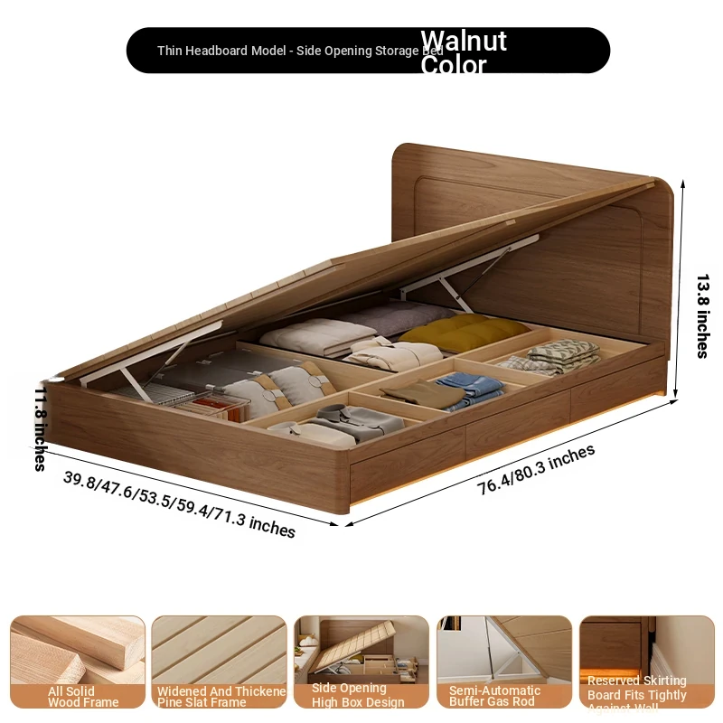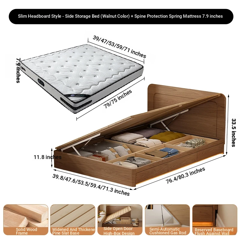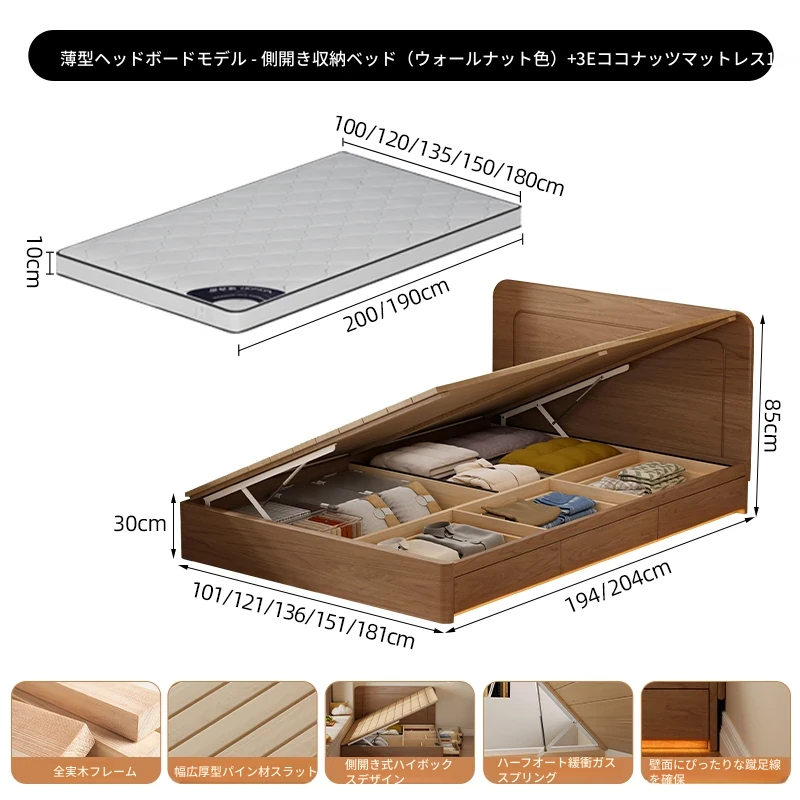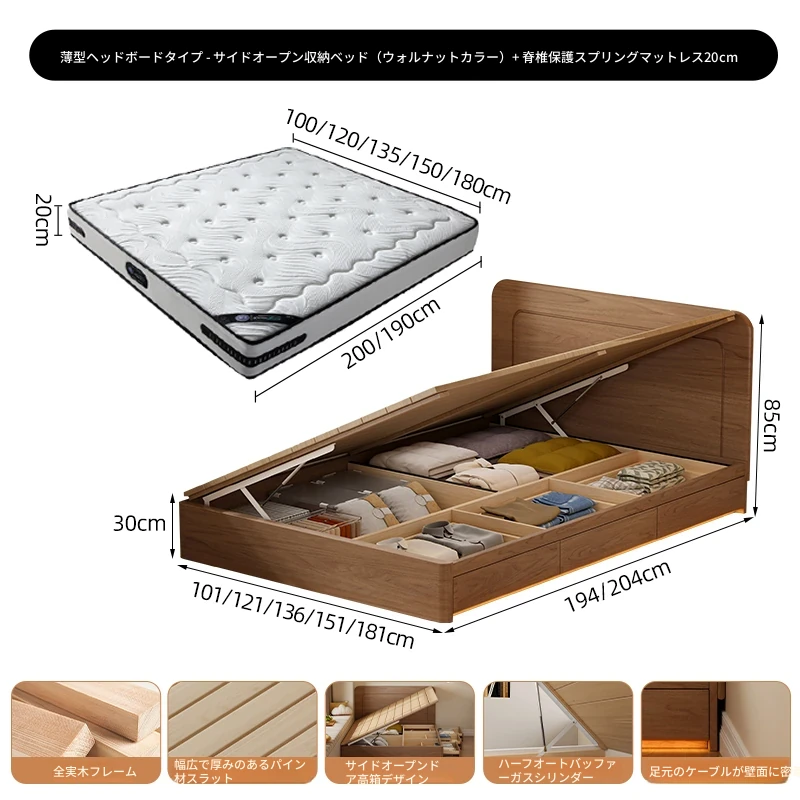 【ウォルナット色】薄型ヘッドボード付き-圧力式側開き収納ベッド+背中を守るスプリングマットレス20cm