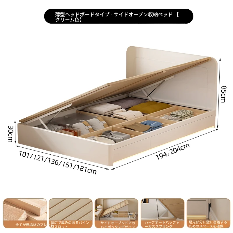 【クリーム色】薄型ヘッドボード付き-圧力式側開き収納ベッド