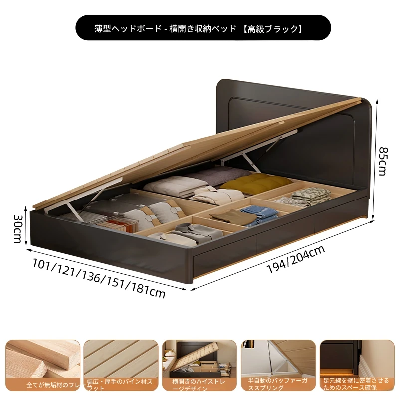 【高級ブラック】薄型ヘッドボード付き-圧力式側開き収納ベッド