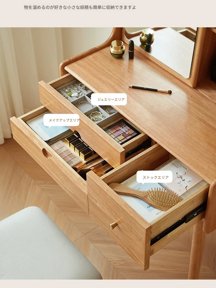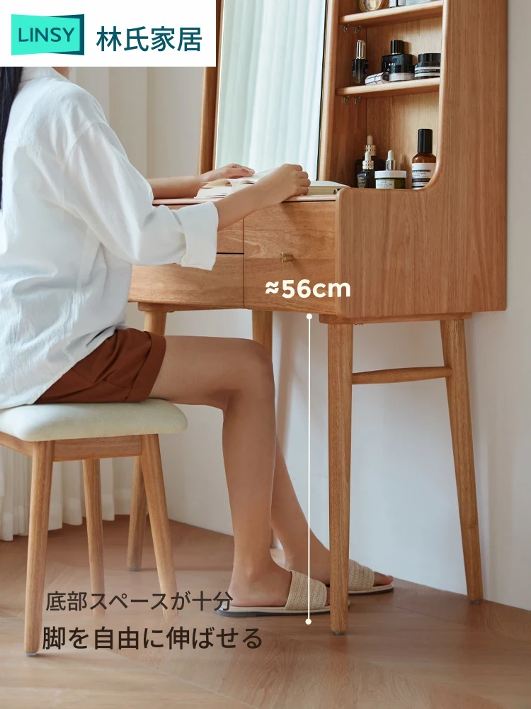 林氏家具の天然木製メイクミラー付きドレッサー - コンパクトでスタイリッシュなベッドルームにぴったりのナチュラルウッドデザイン!限られたスペースでもお洒落にコーディネートできる、林氏木業の一品。