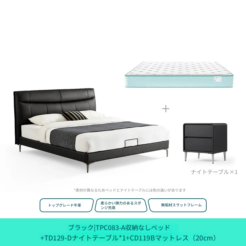 (7)【本革|ブラック】シングルベッド+マットレス+ナイトテーブル