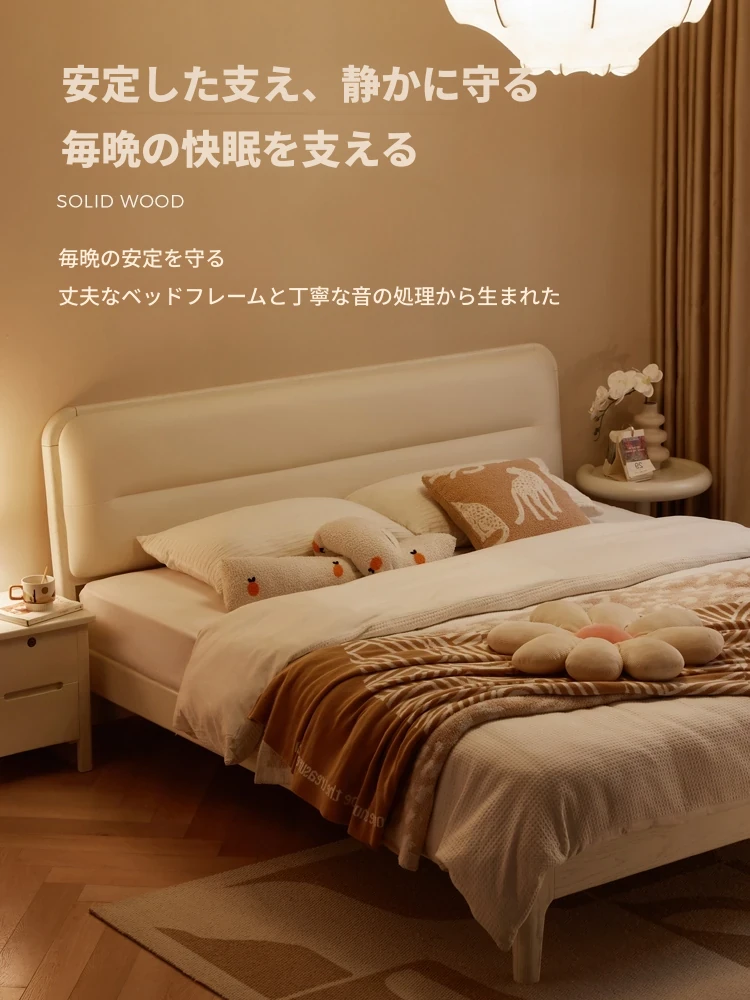 【オーク|スラット】クリームソフトパッキング無垢材ベッド+ナイトスタンド