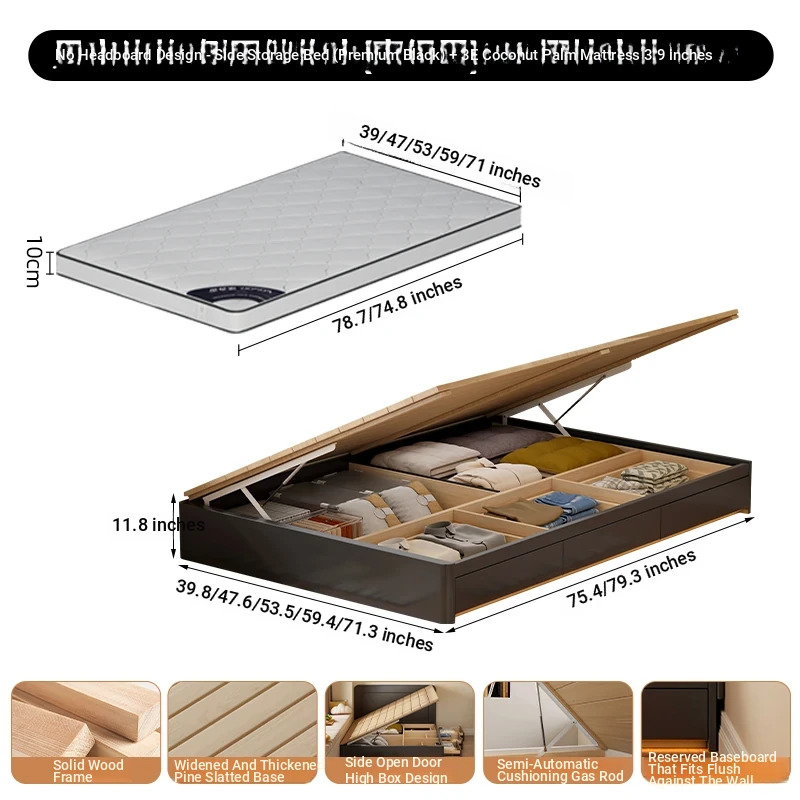 【高級黒】ヘッドレスタイプ - ガス圧式サイドオープン収納ベッド + 3Eココナッツマットレス10cm