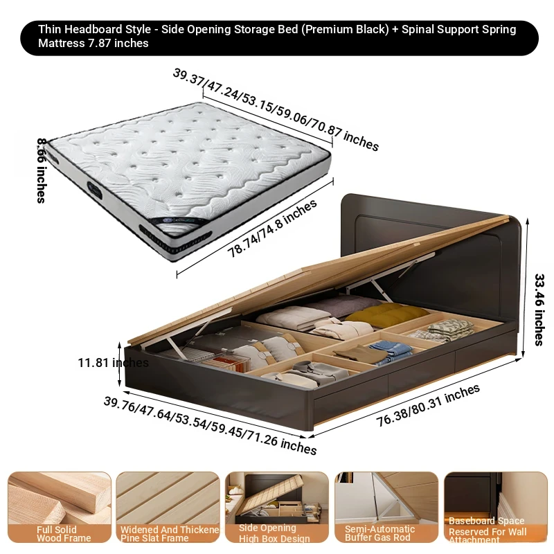 【高級黒】薄型ヘッドタイプ - ガス圧式サイドオープン収納ベッド + 脊椎サポートスプリングマットレス20cm