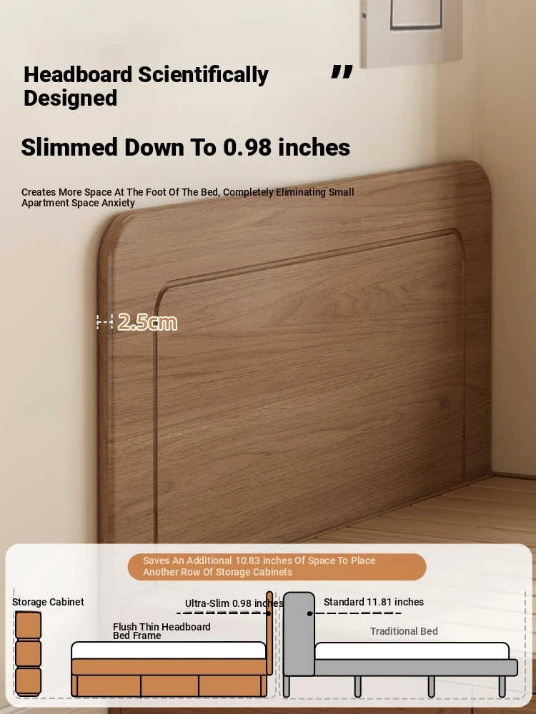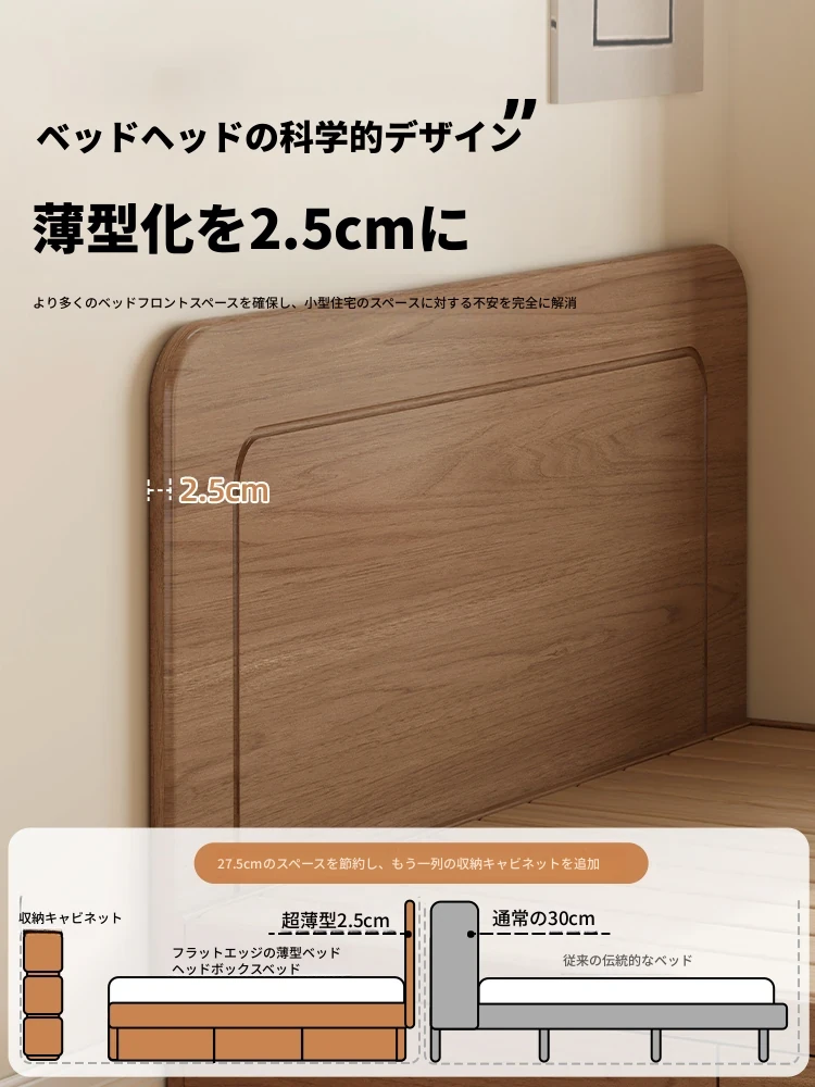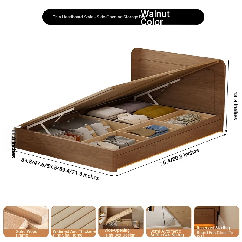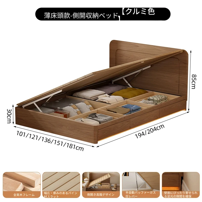 【ウォルナット色】薄型ヘッドタイプ - ガス圧式サイドオープン収納ベッド
