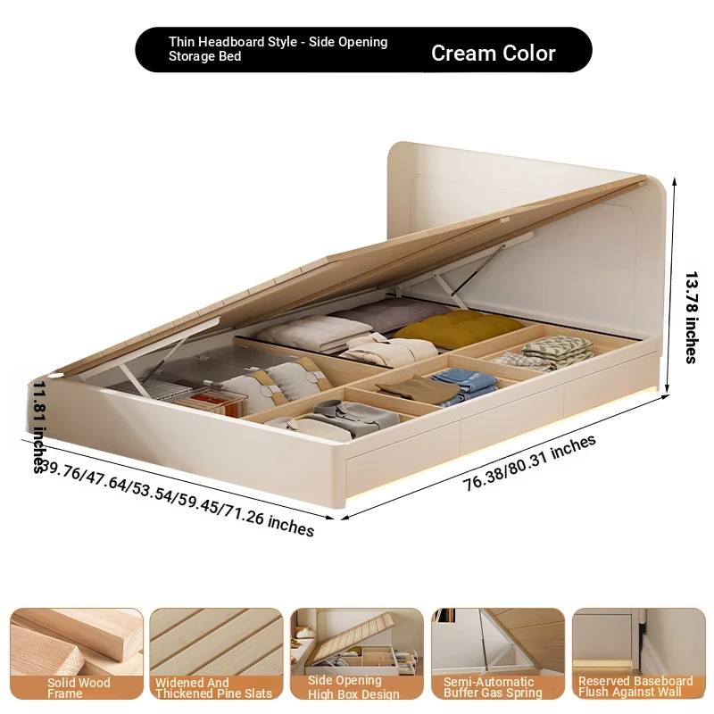 【クリーム色】薄型ヘッドタイプ - ガス圧式サイドオープン収納ベッド + 脊椎サポートスプリングマットレス20cm