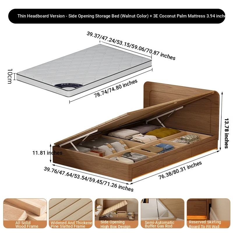 【ウォルナット色】薄型ヘッドタイプ - ガス圧式サイドオープン収納ベッド + 3Eココナッツマットレス10cm