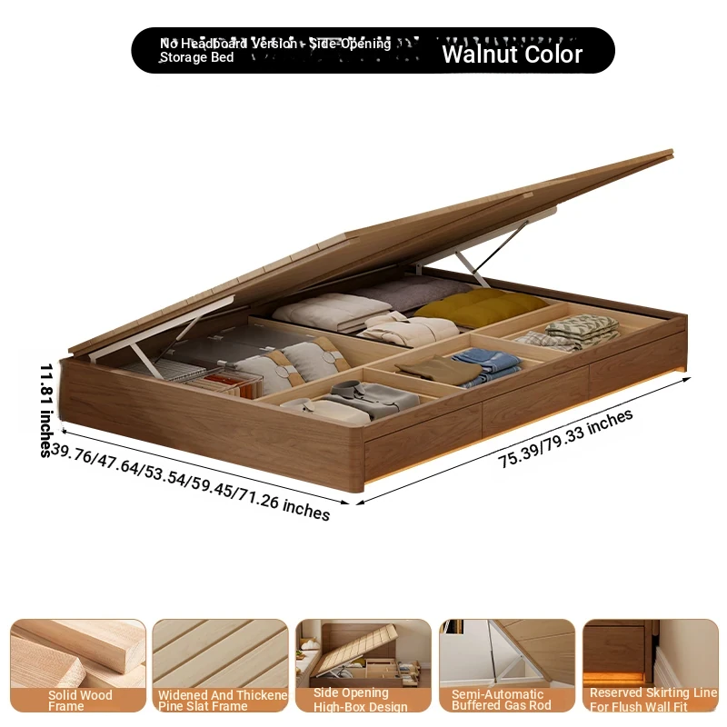 【ウォルナット色】ヘッドレスタイプ - ガス圧式サイドオープン収納ベッド + 3Eココナッツマットレス10cm