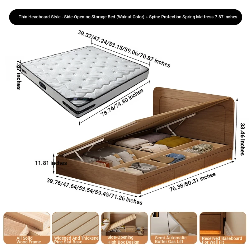 【ウォルナット色】薄型ヘッドタイプ - ガス圧式サイドオープン収納ベッド + 脊椎サポートスプリングマットレス20cm