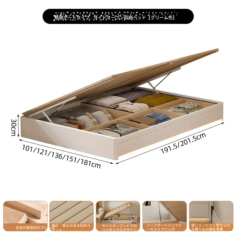 【クリーム色】ヘッドレスタイプ - ガス圧式サイドオープン収納ベッド