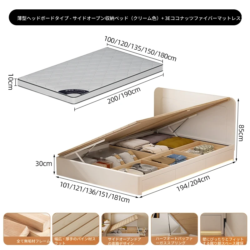 【クリーム色】薄型ヘッドタイプ - ガス圧式サイドオープン収納ベッド + 3Eココナッツマットレス10cm
