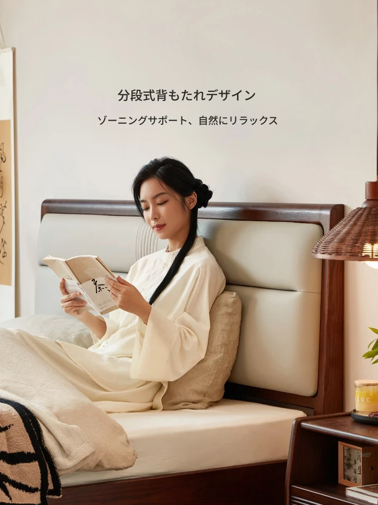 リンシハウス新中式ホワイトアッシュ無垢材ベッド2024年新作ウォールナット色ソフトパッキングダブルベッド、リンシ木業の品質を体感!